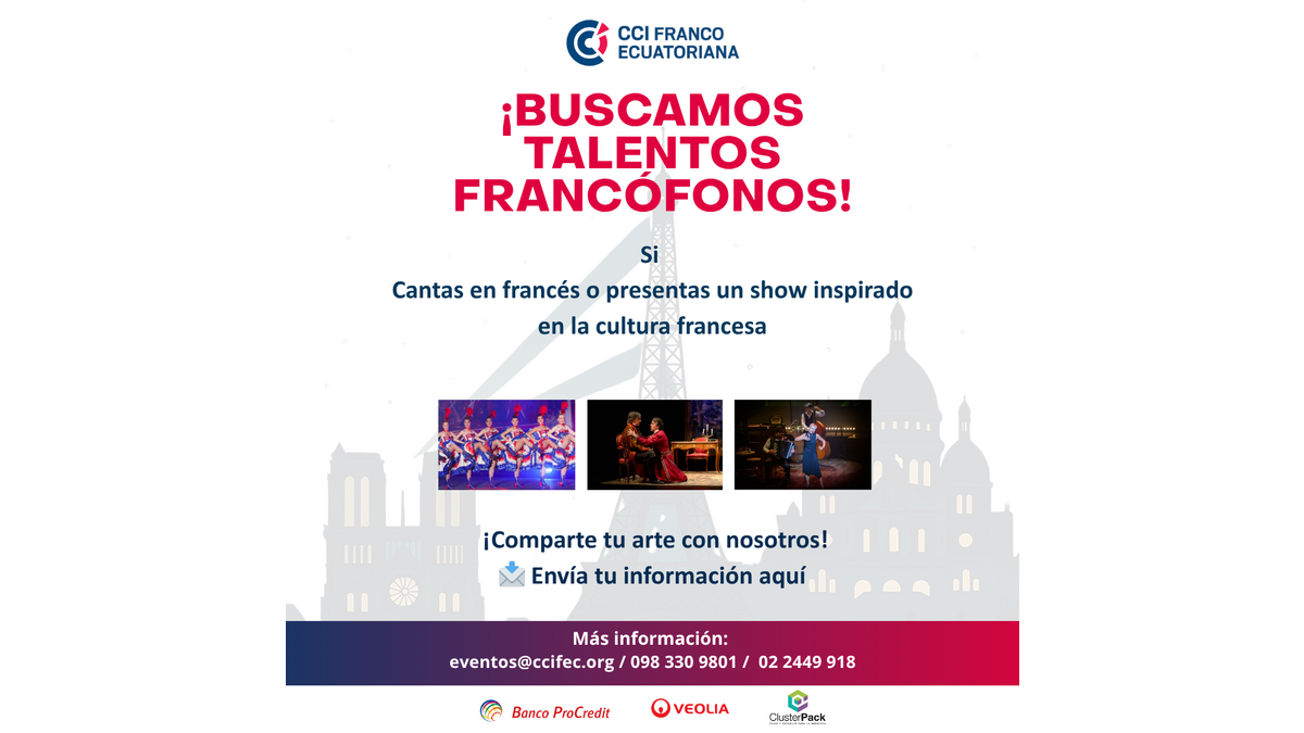 Pour ses différentes activités dans les villes de Quito, Guayaquil et Cuenca, la Chambre de Commerce Franco-Équatorienne est à la recherche d’artistes francophones.