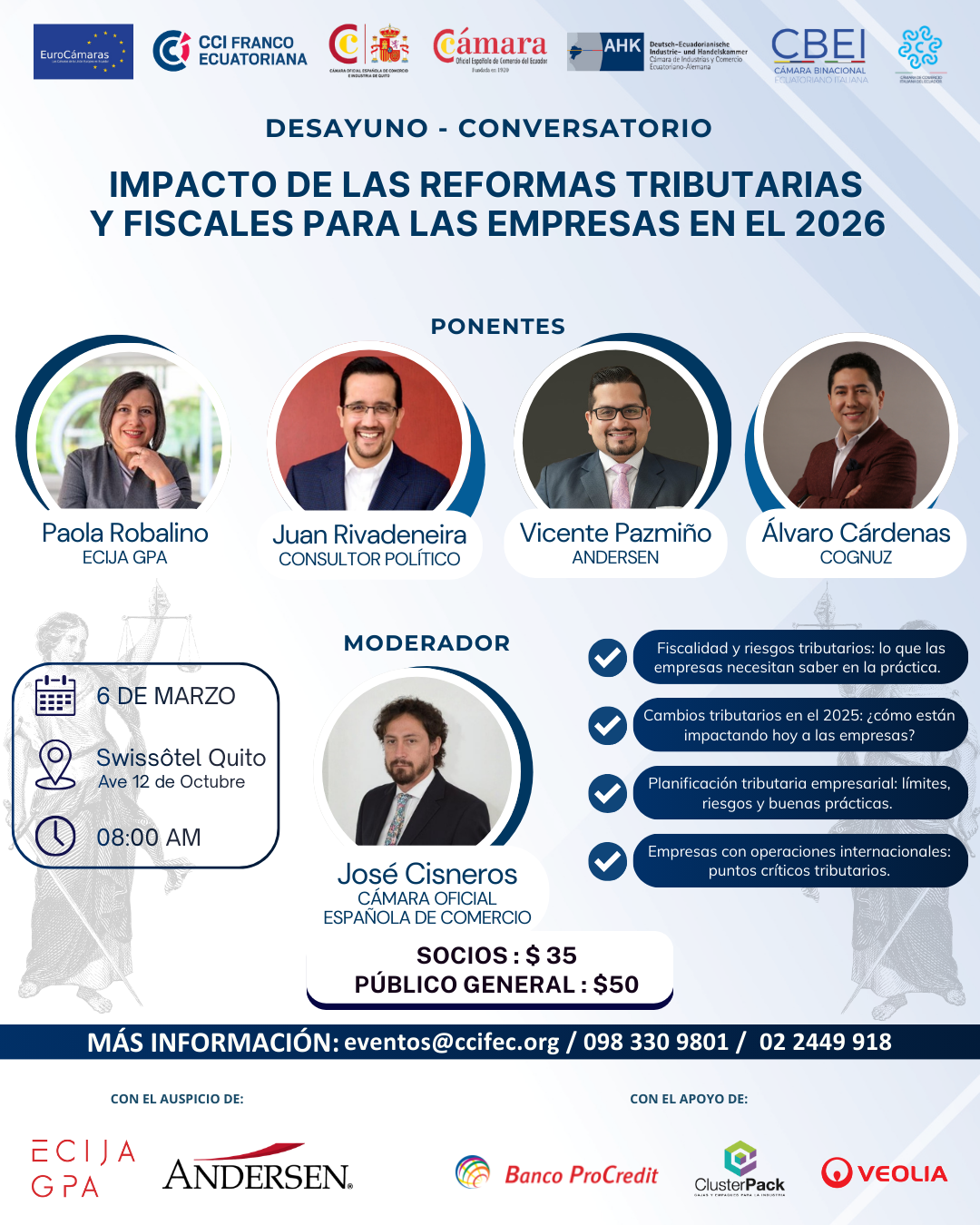 Un espacio de análisis y diálogo orientado a comprender el impacto de los cambios en materia tributaria y fiscal en las empresas, así como las oportunidades que estos generan para una planificación eficiente. Este encuentro permitirá anticipar escenarios, apoyar la toma de decisiones y fortalecer el relacionamiento empresarial.