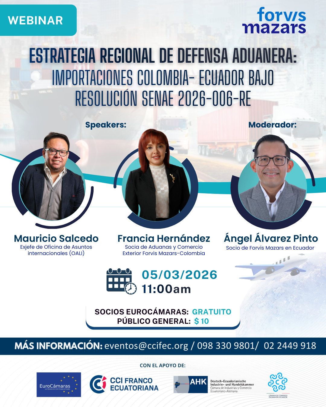 (Francesa, Alemana e Italiana) le invitan a participar en el Webinar: “Estrategia Regional de Defensa Aduanera: Importaciones Colombia–Ecuador bajo la Resolución SENAE 2026-006-RE”, un espacio de análisis y diálogo estratégico orientado a comprender los alcances de esta normativa y su impacto en las operaciones de comercio exterior.