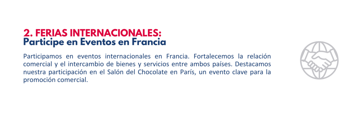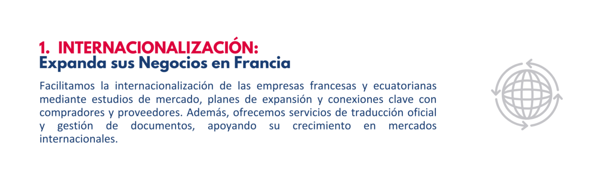 Con 35 años de experiencia, ofrecemos una plataforma integral de servicios que conectan negociaciones, promueven la innovación y potenciales oportunidades comerciales entre Ecuador y Francia.