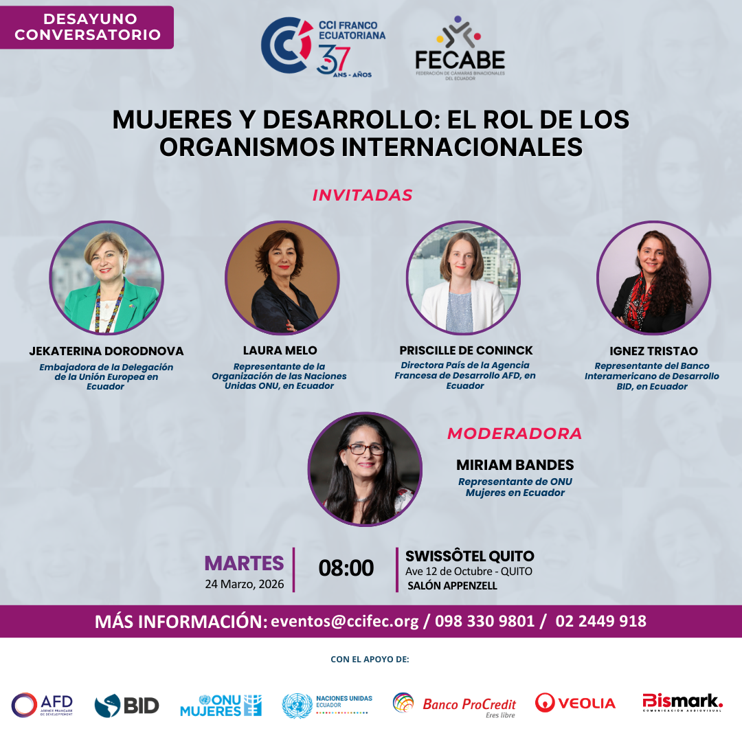 En el marco del Mes de la Mujer, la Cámara de Comercio Franco-Ecuatoriana tiene el placer de invitarle a un desayuno de diálogo con representantes de instituciones internacionales.