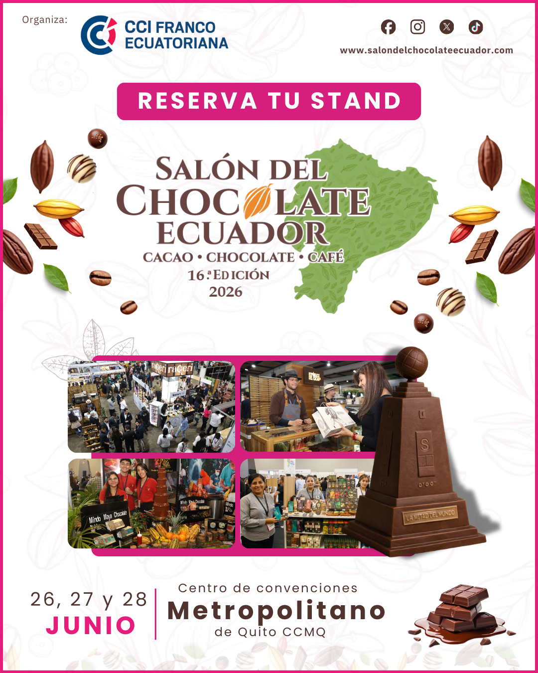 Nous avons le plaisir d’annoncer que la 16ᵉ édition du Salon du Chocolat, Cacao et Café Équateur a désormais une date et un lieu confirmés : les 26, 27 et 28 juin 2026, au Centre de Conventions Métropolitain de Quito, Parque Bicentenario.