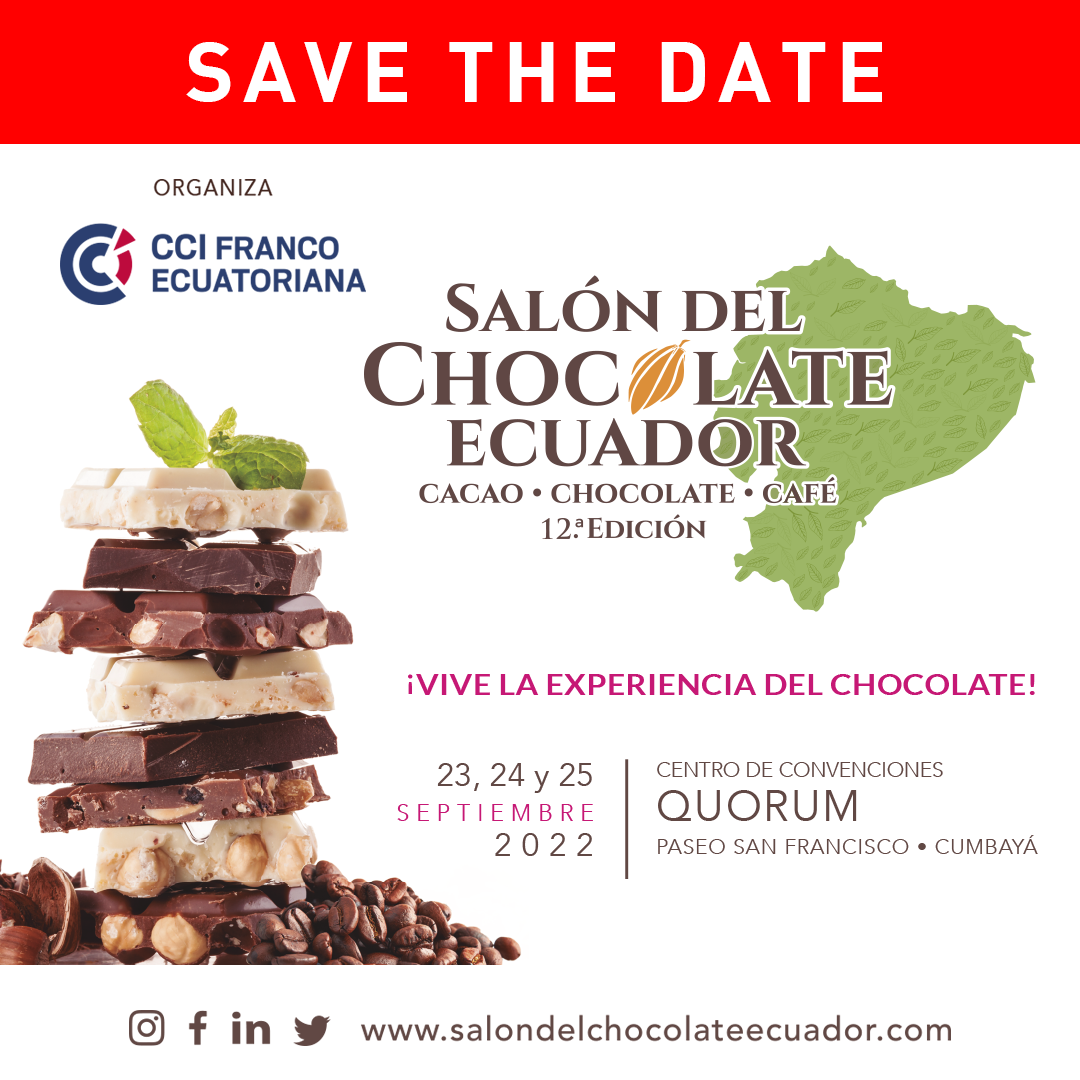 La Chambre de commerce et d'industrie franco-équatorienne (CCIFEC) organise la 12e édition de El Salón del Chocolate, Cacao y Café Ecuador 2022. L'événement aura lieu les 23, 24 et 25 septembre 2022, au Centro de Eventos y Negocios Quórum del Paseo San Francisco à Cumbayá.