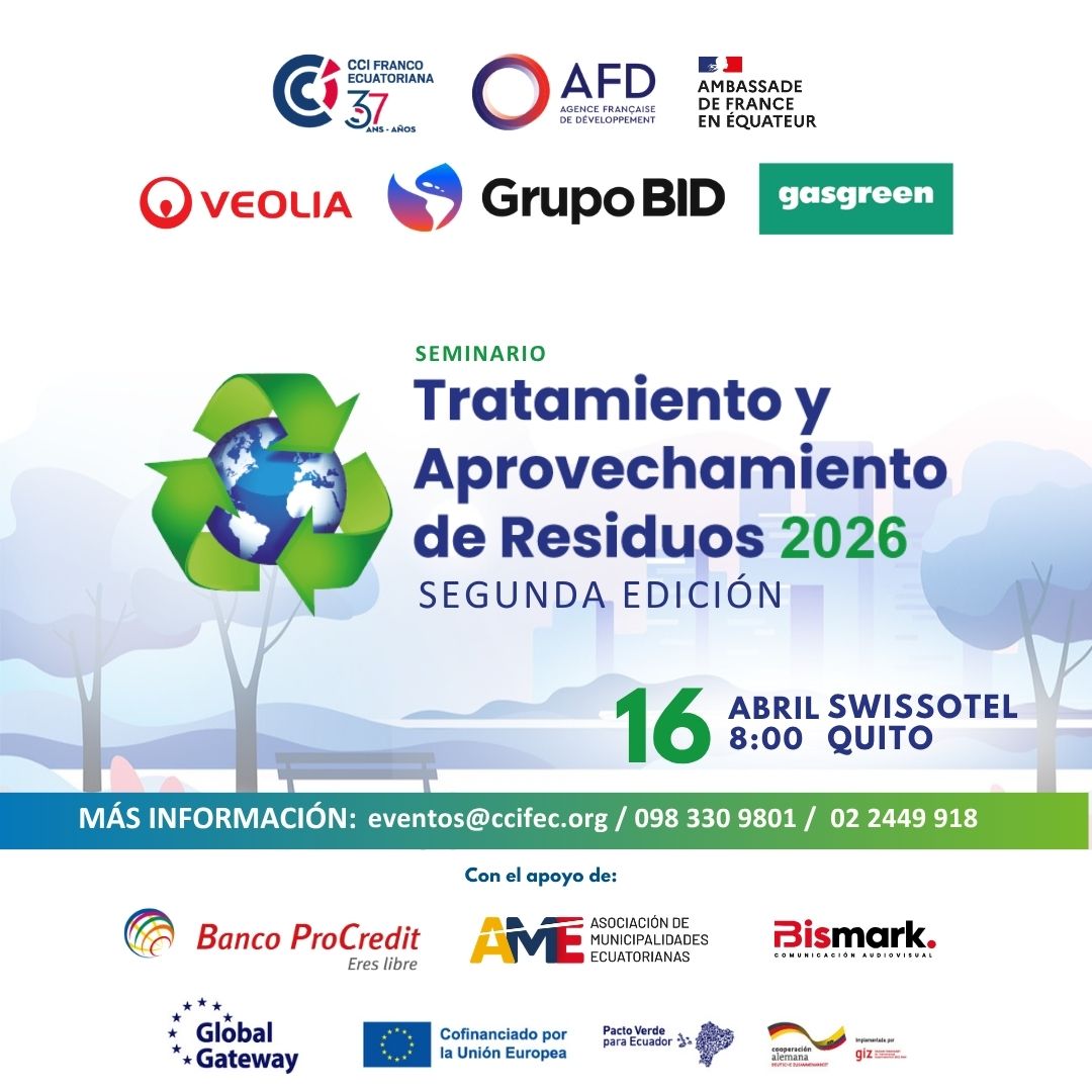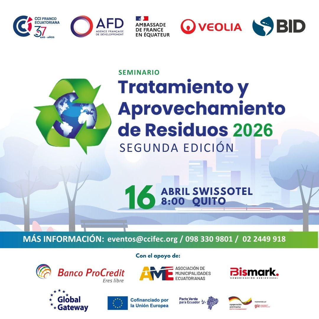 La Cámara de Comercio e Industrias Franco-Ecuatoriana (CCIFEC), en coorganización con la Agencia Francesa de Desarrollo (AFD), La Embajada de Francia en Ecuador, VEOLIA y el Banco Interamericano de Desarrollo (BID) tienen el placer de invitarles a la 2da edición del Seminario: Tratamiento y Aprovechamiento de Residuos 2026