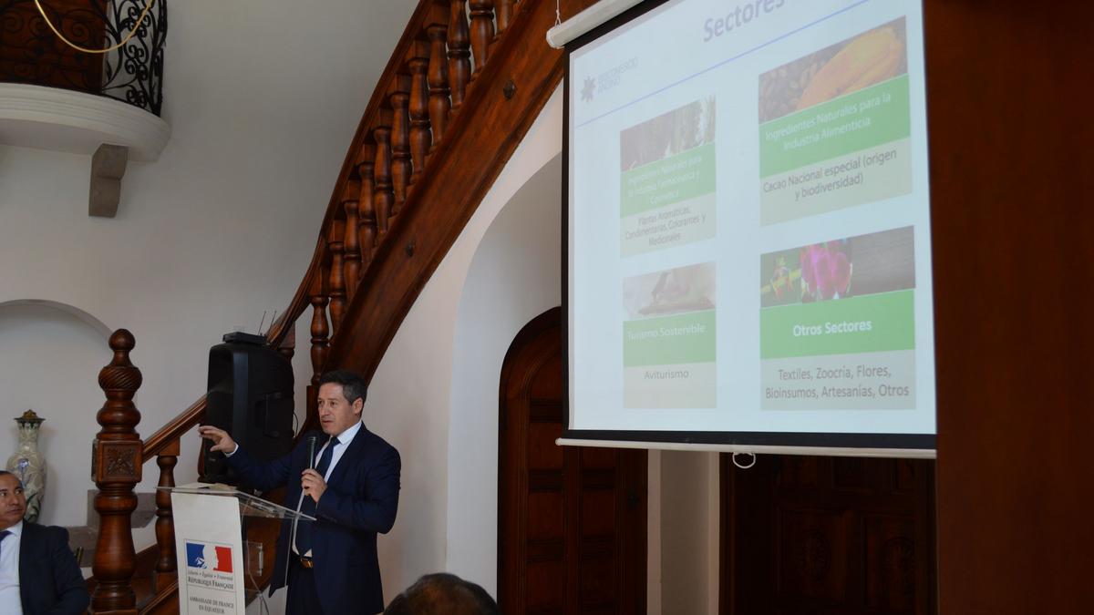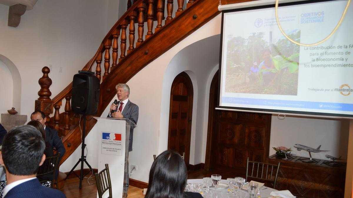 Ce déjeuner-conférence axé sur le thème de la « Bioéconomie » a été enrichi par la présentation de Juan Manuel Garcia, Directeur de la Faculté de Biologie et Biomédecine de l’Université Technique Particulière (UTP) de Loja, qui a traité des modalités de financement des activités de développement de marché dans le secteur de la bioéconomie en Equateur.